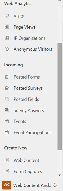Once this has popped open, look at the navigation pane to the left and at the very bottom you’ll notice that ClickDimensions have separated out the functionality of the product into two different areas: Email and Messaging, and Web Content and Analytics. This new menu navigation makes it easy for the end user to access the entities related to the specific task they are working on: