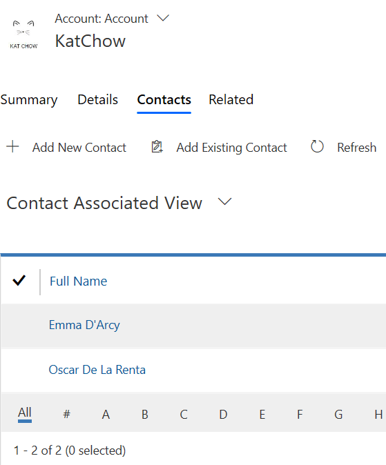 Underneath Accounts we will often have Contacts. Contacts are people who either have a relationship with the Account or are stand alone individuals but are generally considered to be people you are currently doing business with or have done business with in the past. In the previous example, we have Oscar De La Renta as the Primary Contact for the KatChow Account. As a user of Dynamics CE, I would assume that the main point of contact for the account is Oscar. We can also have multiple Contacts associated with the Account: