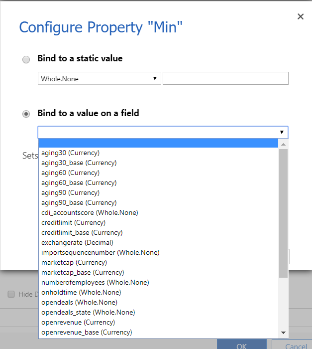 Let’s take a look at the Min/Max customisations. We have the ability to either designate a static value for the Min/Max or we can assign it to another field on that record: