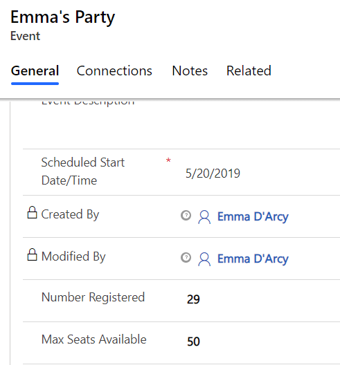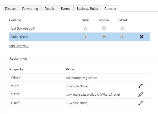 Implementing the Radial Knob is extremely similar to the linear slider. In this example, I will demonstrate binding a max value to another field on the record. Our use case here is for an Event entity that will clearly show the number of registrants, using the Maximum Available Seats field as our bound max value. Here’s what those fields look like before implementing controls: