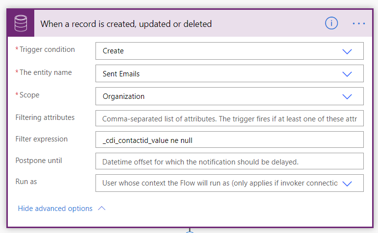 I have also set a Filter on this action that will only trigger on records where the Contact value is not empty. If you’re not sure how to achieve this, check out this blog by Sara Lagerquist. Once we have the correct record, we need to retrieve the Contact record via the Get Record action. This will allow us to reference values on the Contact related to the Sent Email record.