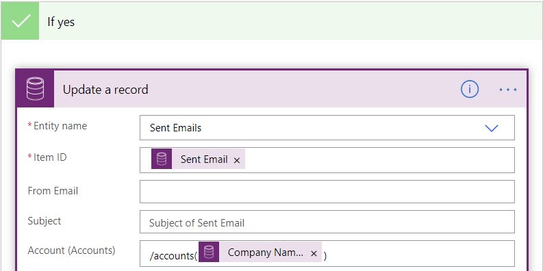 Here I am checking if the “Company Name” field on the Contact record has a value. If the condition is true, I’m going to update the Sent Email record with this value: