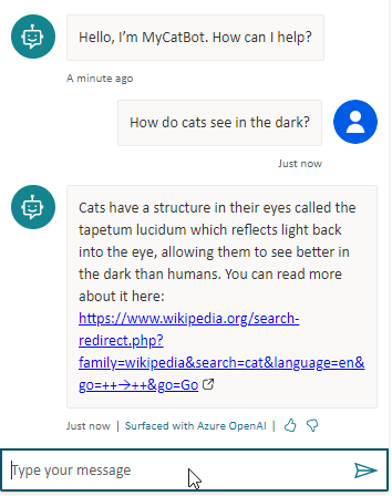 Give the bot a few minutes to spin up and once it’s ready, you can start to ask the bot questions and get a feel for the capabilities: