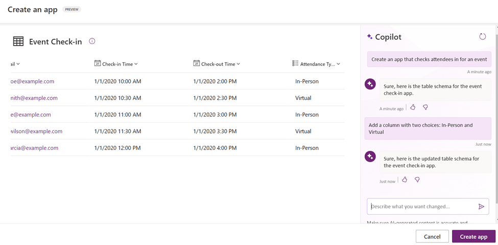 First, let’s look at Maker Enablement with CoPilot. We can easily use CoPilot to help us create apps, flows, chatbots and even websites. With CoPilot for Power Apps, we can describe an app and have AI create the tables and even the basics of the app for us: