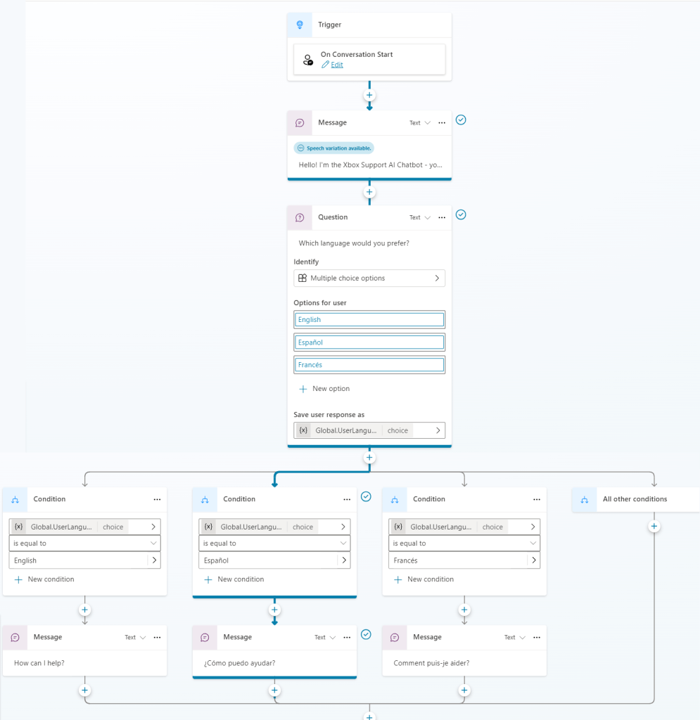 Similarly to everyone else, a large portion of my time has been taken up by exploring possibilities with GenAI and Copilot Studio. Recently, I decided to test out it’s capabilities by adding in translation into the mix. In this example, I will give our end user the option to select a language and have our chatbot respond in the chosen language. So our conversation flow will look something like this: